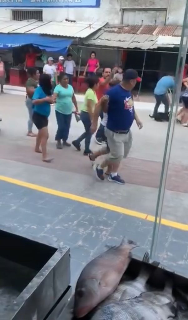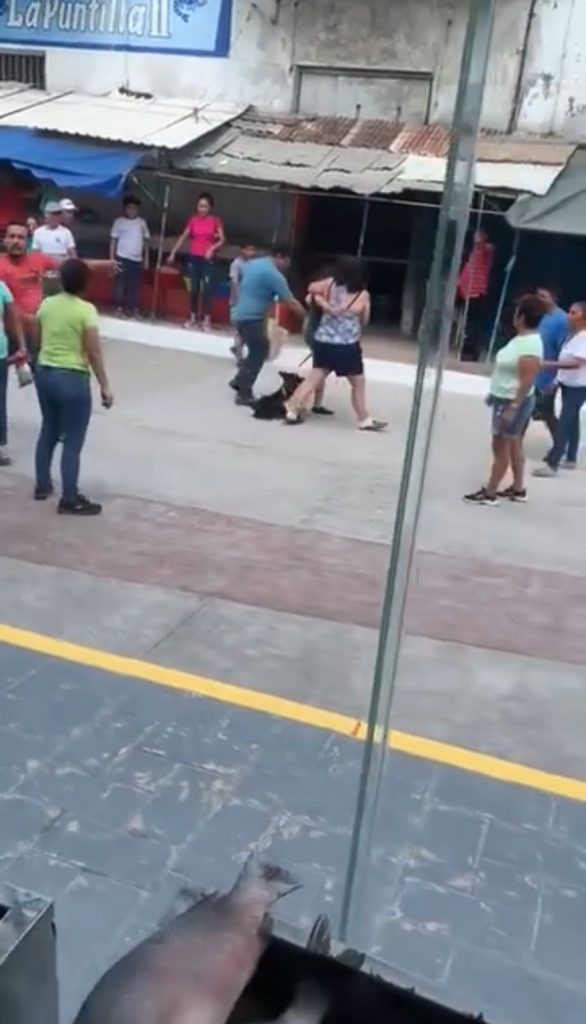 La pelea inició cuando una señora acudió a comprar en compañía de su familia y su mascota al mercado, moluscos frescos, además de disfrutar a la vista que ahora se tiene en el centro de abasto; sin embargo, el perrito defecó en la vía pública.